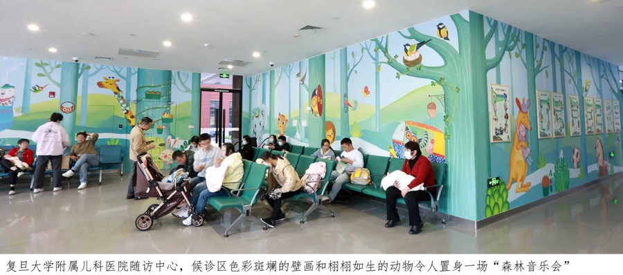 家长及宝宝走进随访中心,仿佛步入一个梦幻的“森林音乐会”,色彩斑斓的壁画和栩栩如生的动物形象,有可爱的宝宝趴在大象用鼻子蜷成的怀抱中熟睡、有融入“袋鼠式护理”照护理念的主题画作等,将原本素净的墙面打扮一新,令候诊区域仿佛置身于童话舞台。在环境设计和空间布局上,随访中心无论是色彩选择还是区域划分,每一处细节都聚焦儿童的心理需求与家庭的情感体验,凸显了儿童友好医院建设的空间友好及服务友好理念。