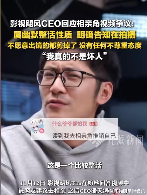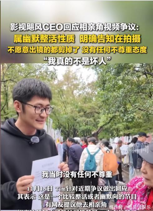 面对争议,Tim在11月15日发布了回应视频,他解释说,整个相亲角环节其实只占了节目的5%,实际拍摄20分钟,最终成片才50秒,这段内容是应网友要求,延续了之前关于婚庆行业简历的讨论,本意是想做一期轻松幽默的节目,拍摄团队事先做了场地报备,全程都保持着专业的工作态度。